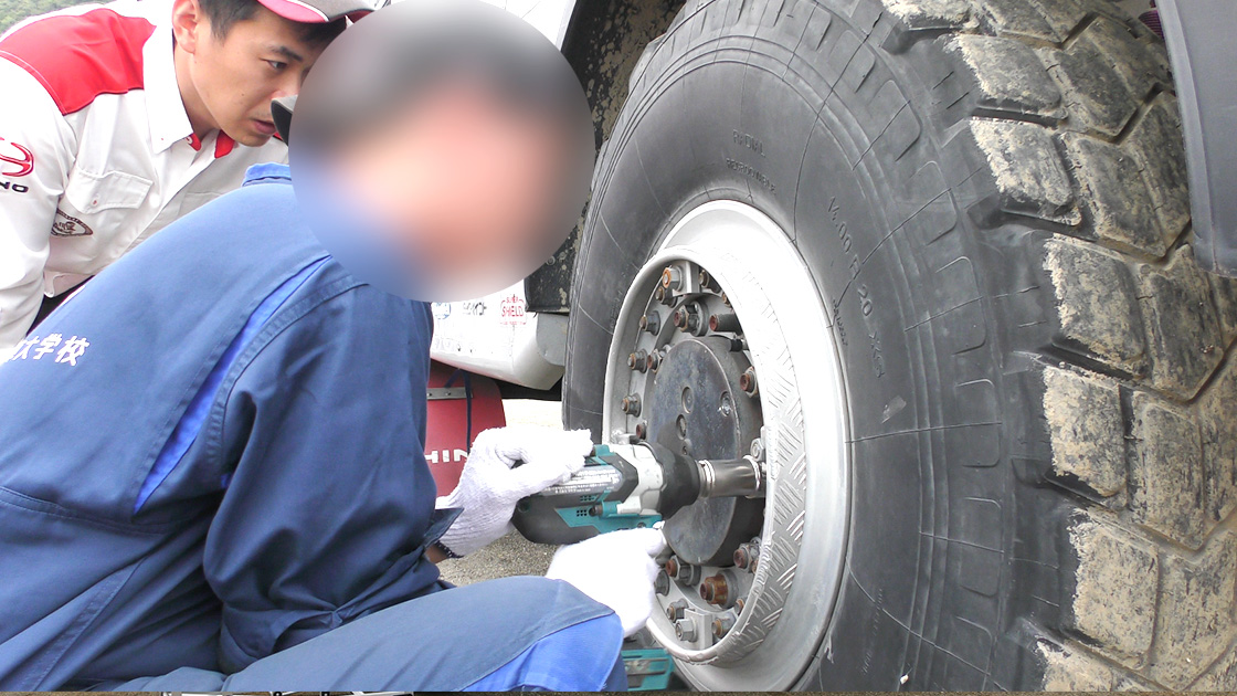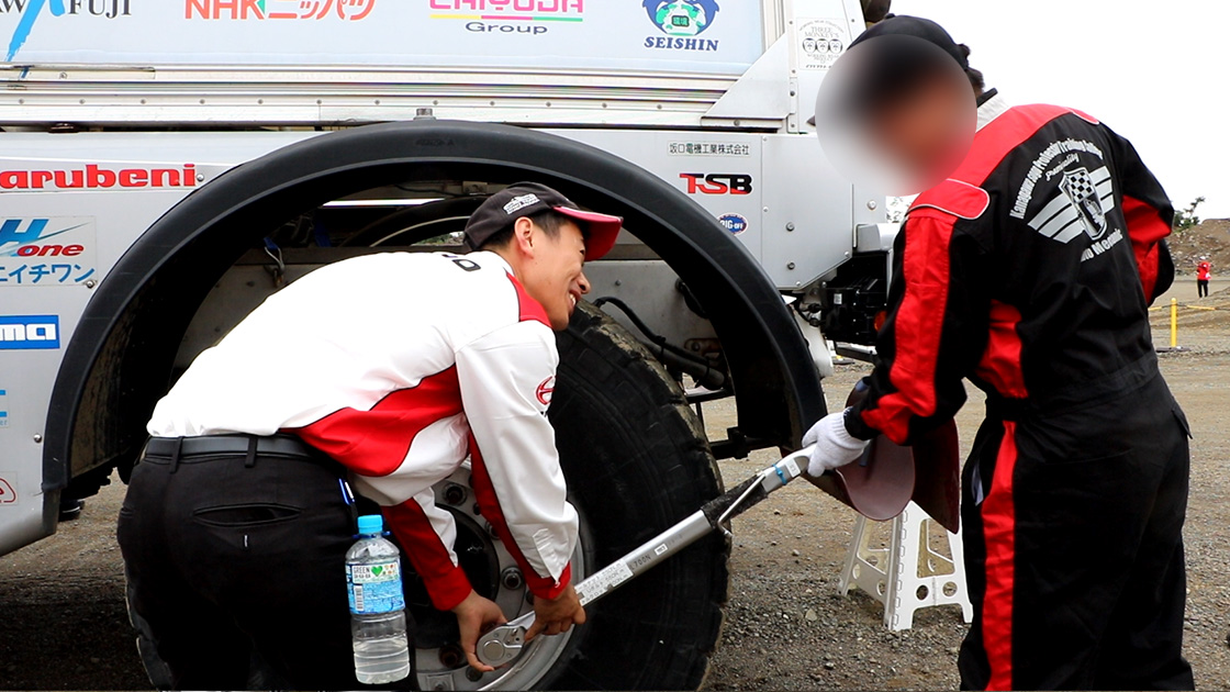 また、整備体験コーナーでは、実際のレーシング車両を使用した簡易整備作業を通じて、車両構造やメンテナンスの重要性について学んでいただきました。学生の皆様は、ダカール・ラリーに出場経験のある南関東日野のメカニックによる指導のもと、工具を使った作業に取り組み、整備の奥深さと楽しさを体感いただきました。