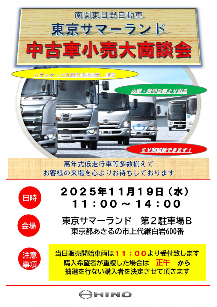 2025年11月19日(水)に東京サマーランド 第2駐車場にて、中古車小売大商談会を開催いたします。